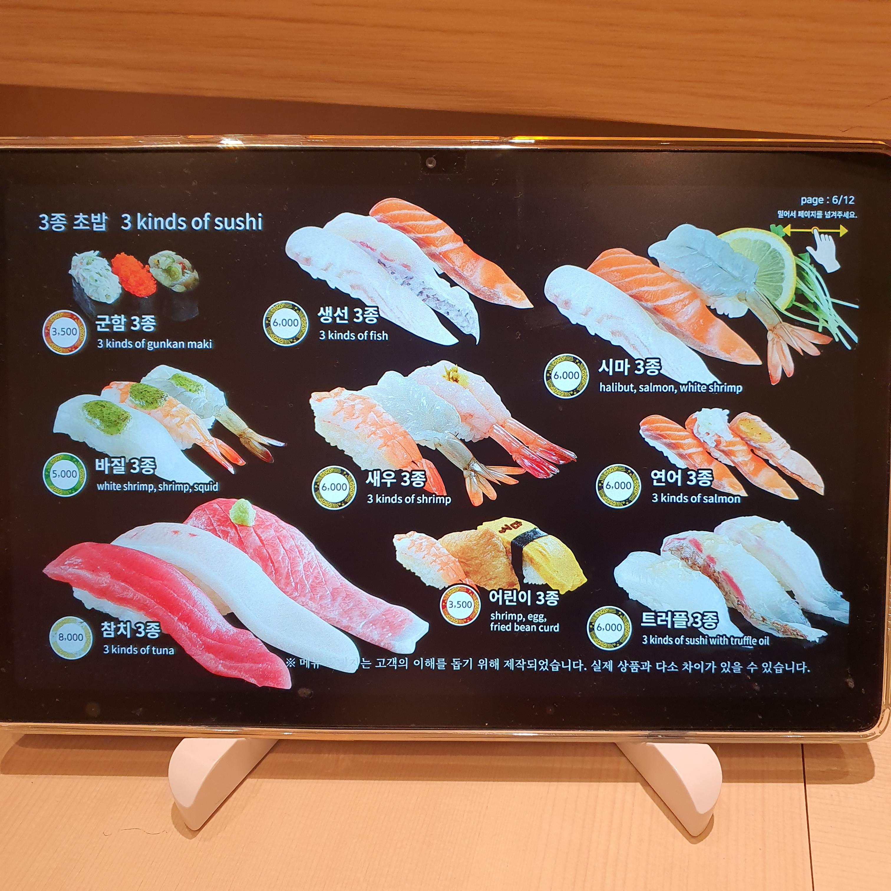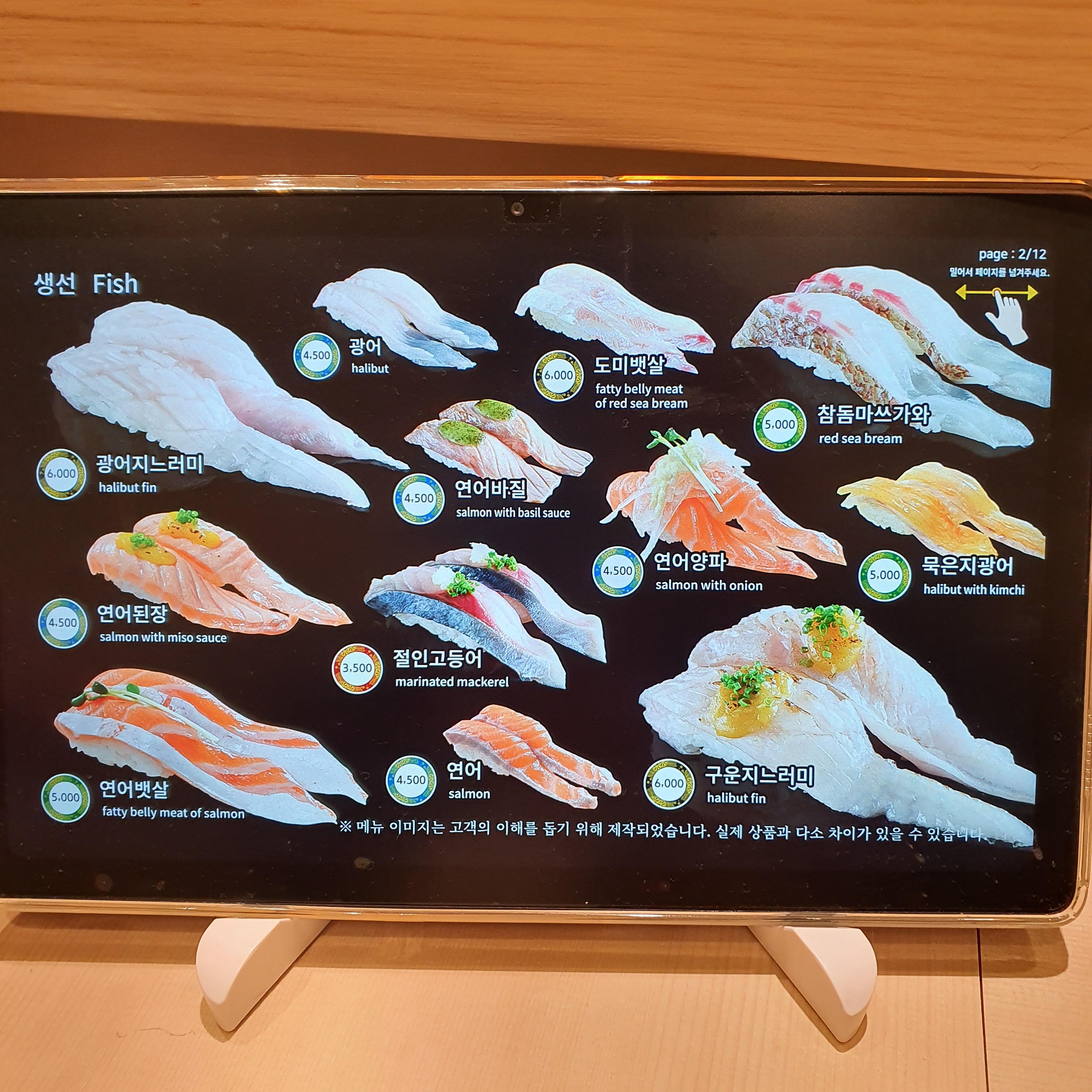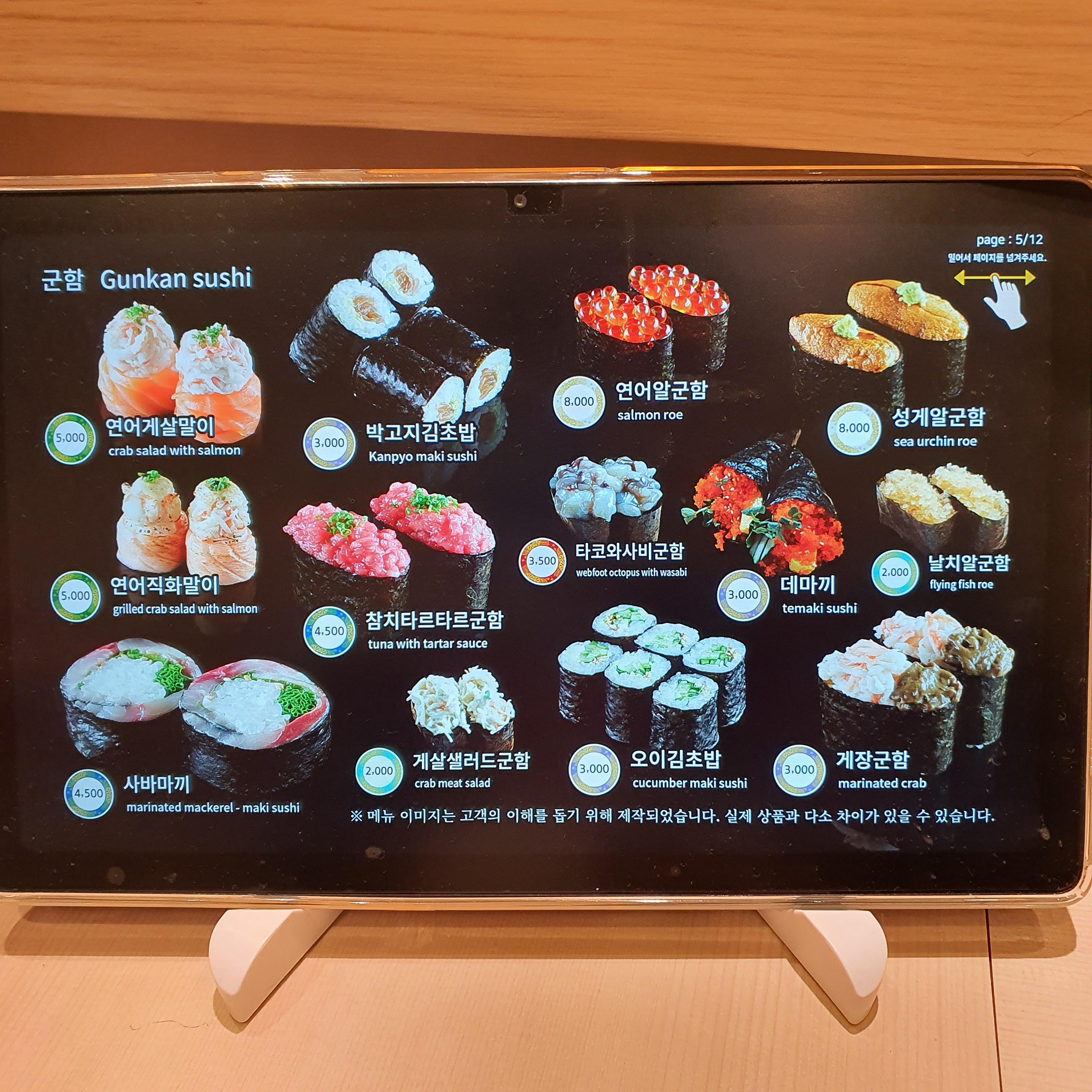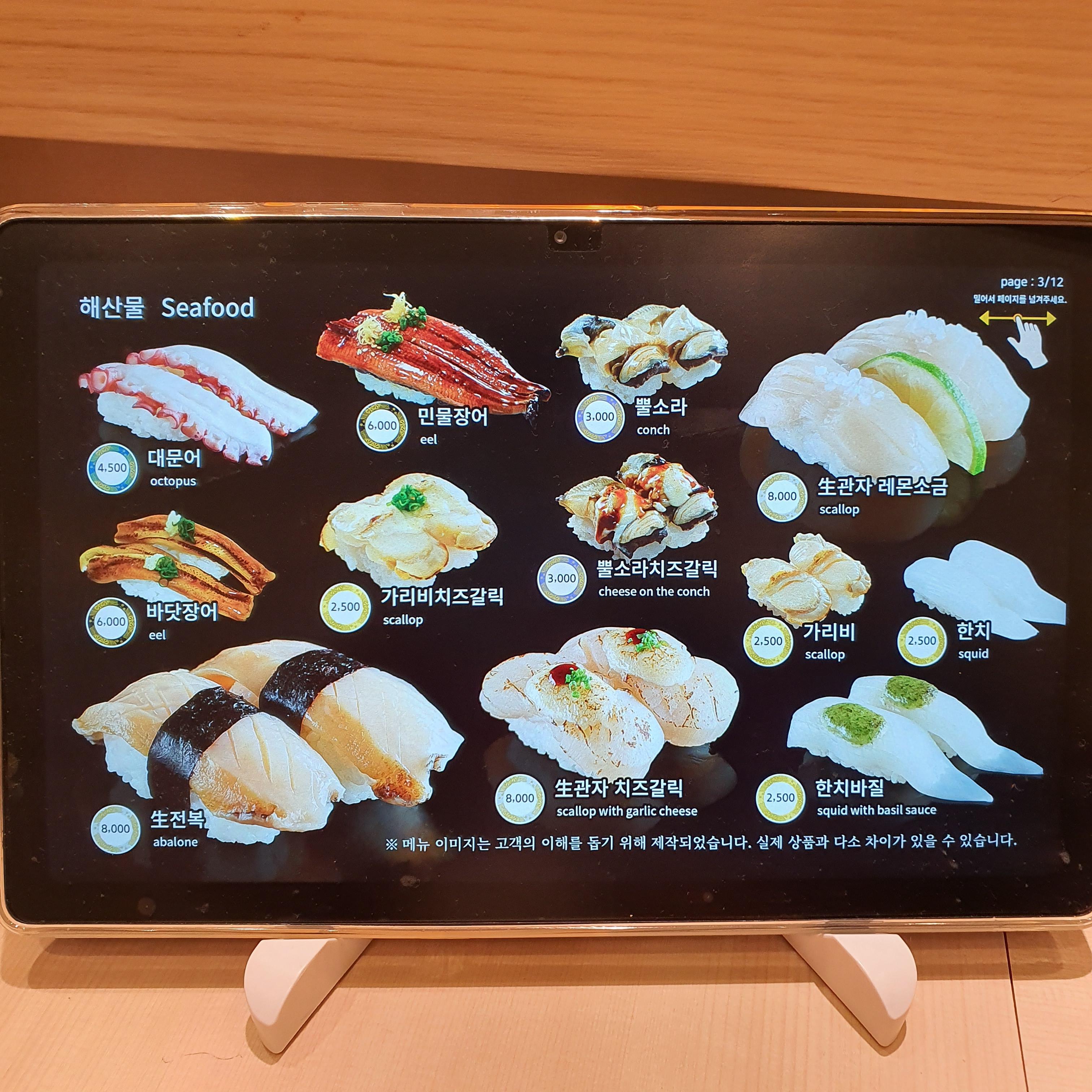 맨 처음에 봤던 메뉴판이 무색하게 각 테이블에서 이렇게 어떤 초밥이 있는지 이미지로 볼 수 있습니다.